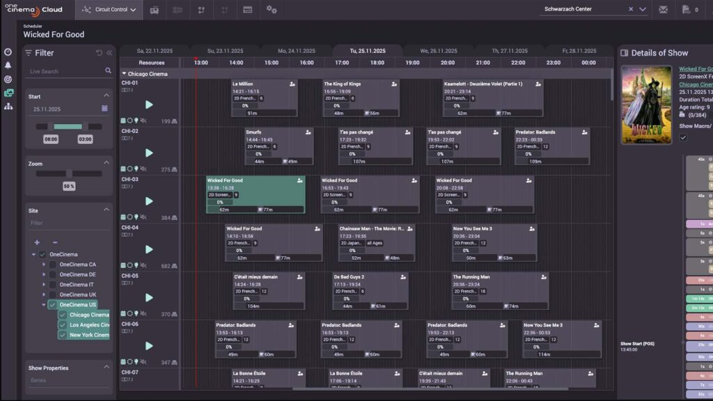 The Scheduler not only gives the technicians all the important show information to the current and upcoming shows in real-time - also the cashier staff as well as the cleaning staff have a perfect insight into the relevant times. For example, your cashiers can see the "real" start and credit offset time of all shows at one glance.