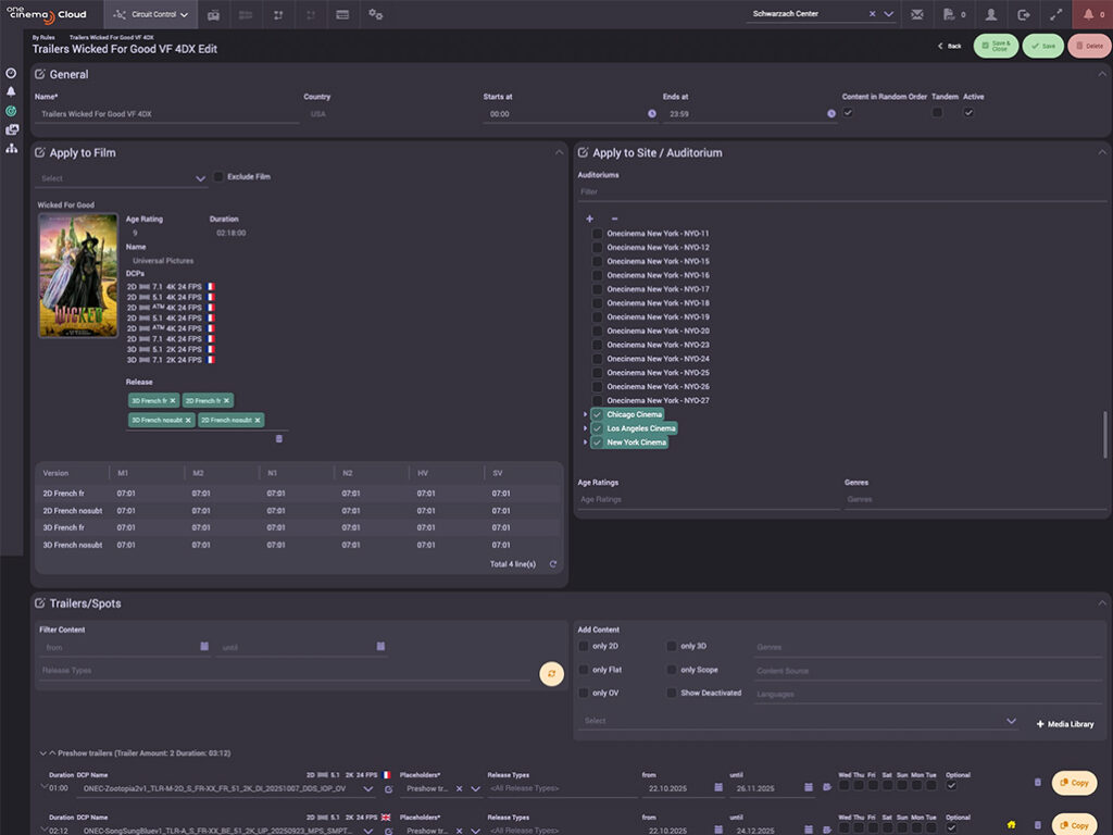 Integrated DCP Trailer Media Library. The trailers of your preferred content supplier can be viewed and selected directly in the TMS via API integration. This eliminates the need for time-consuming logins to various trailer portals.