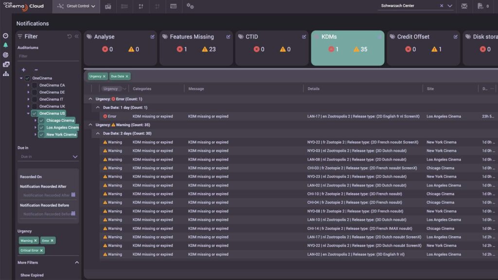 The practical early warning system informs your employees in good time ahead of a show whenever there is a problem that requires intervention. This way, show failures due to missing content or missing, invalid or expired KDMs are a matter of the past. If at any time you happen to forget something, our early warning system will inform you.